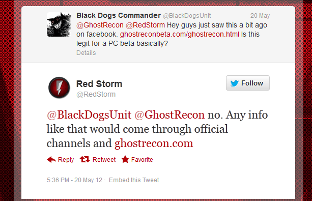 While little evidence of the GhostReconBeta.com scam website can be found online, Ubisoft Red Storm responded to a Twitter message from gamer @BlackDogsUnit back in late May, saying that the website ghostreconbeta.com was not legit and any information about Ghost Recon would come through official channels on GhostRecon.com.